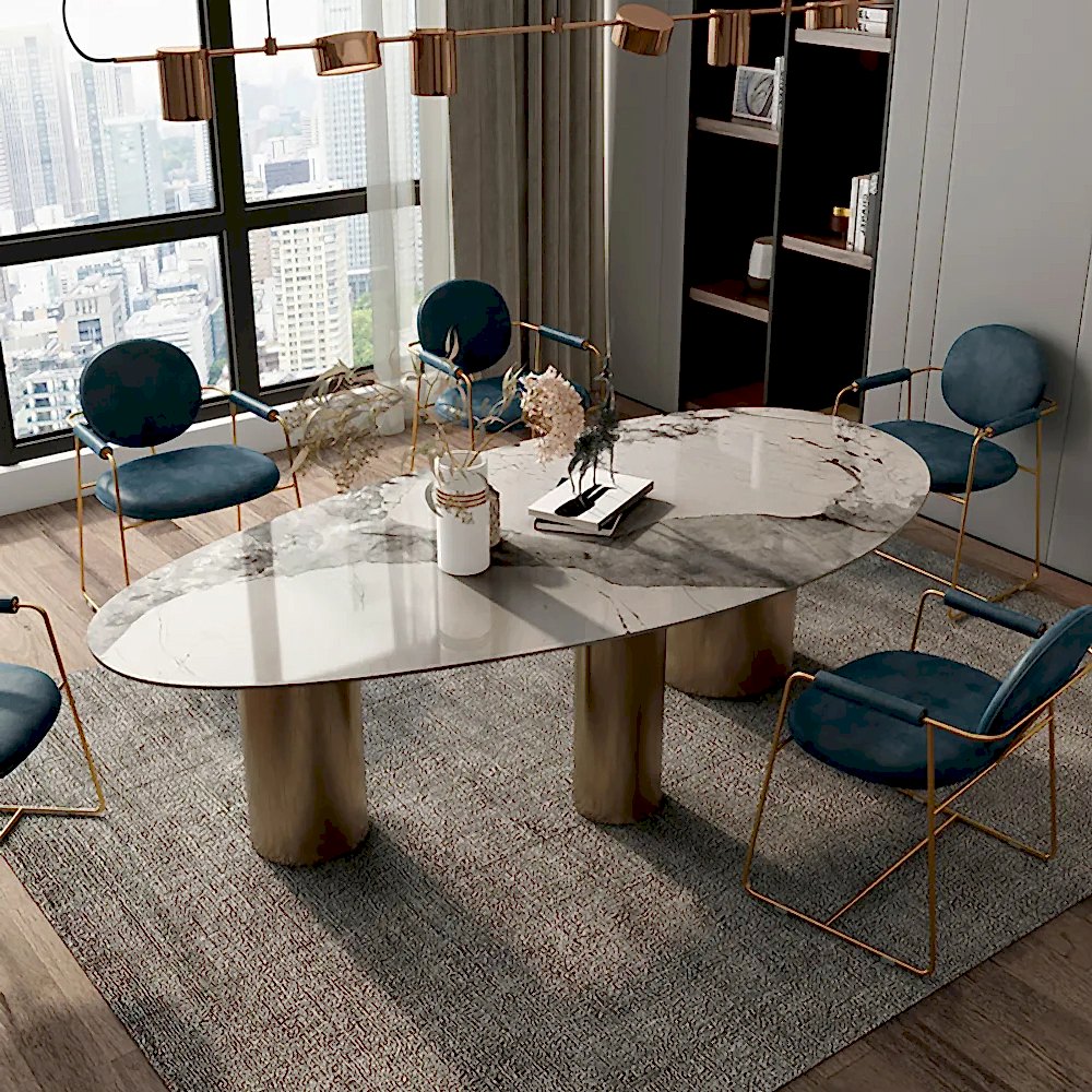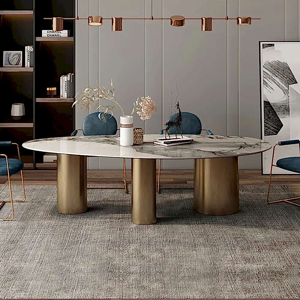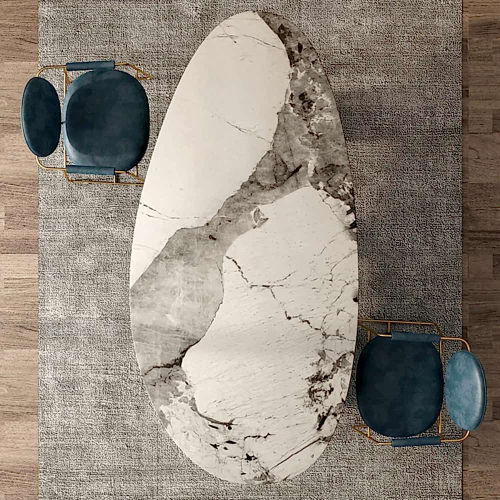115x250cm ölçülerinde, elips kesim italyan porselen masa, mermer desenli.