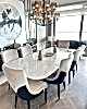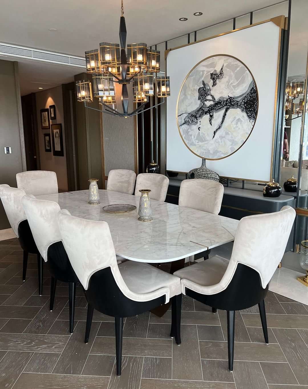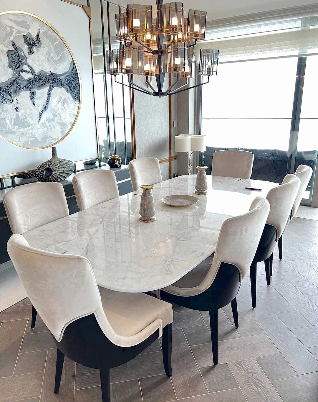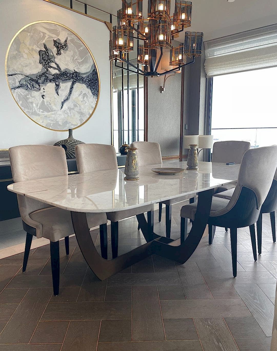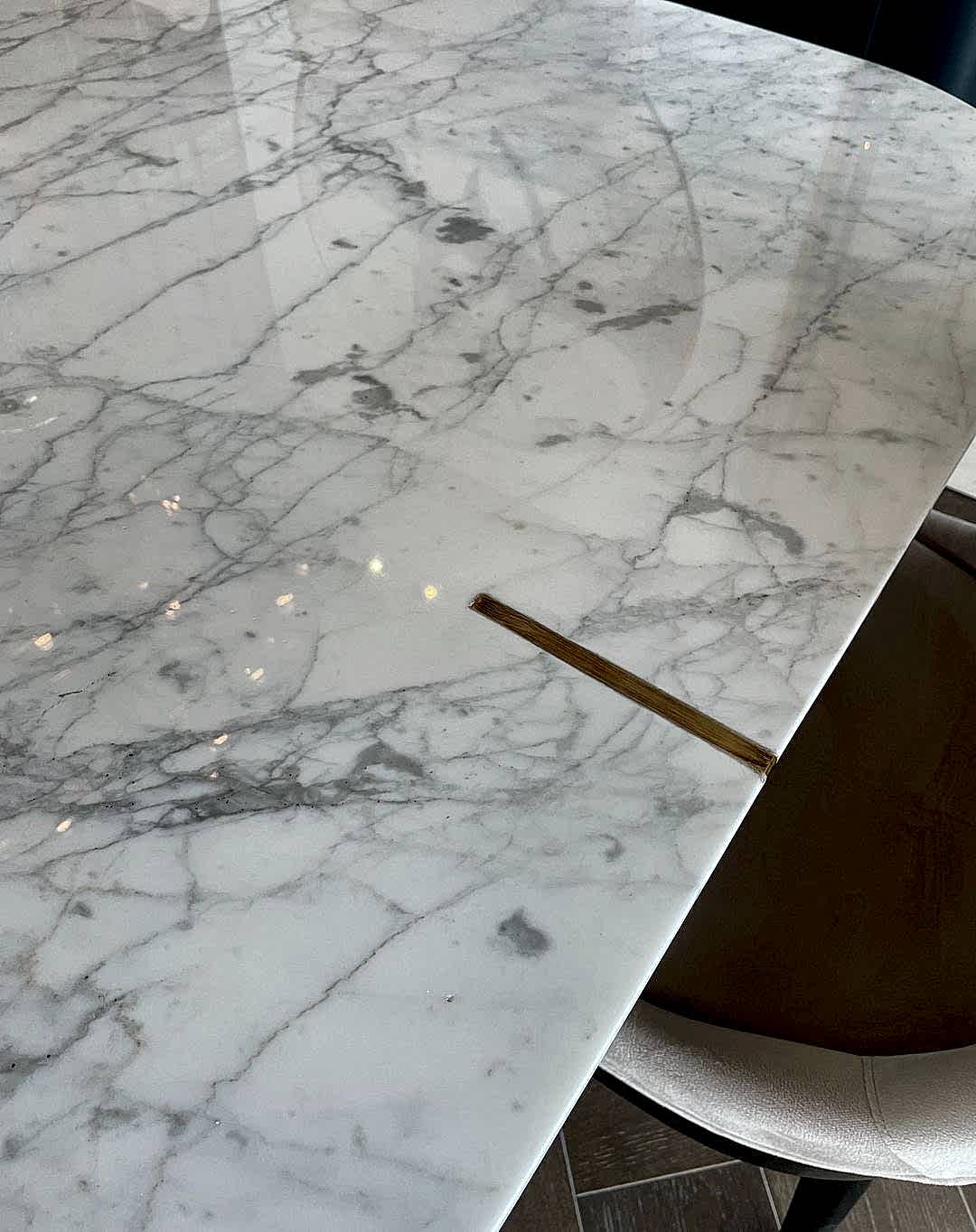 Ahşap ayaklı, içinde gerçek pirinç olan, Pirinç Detaylı Calacatta Mermer Masa