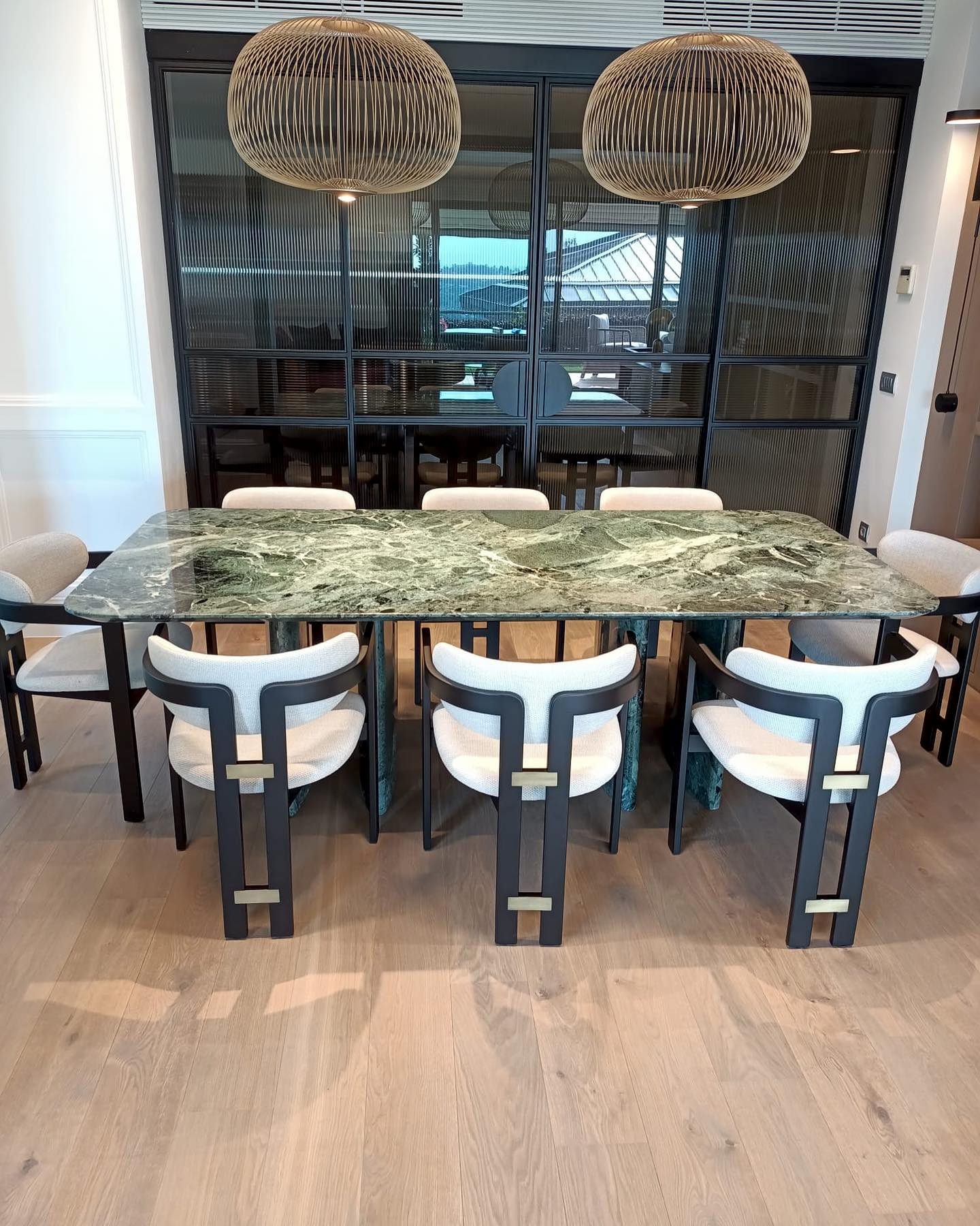 Verde Alpi Yeşil mermer masa, ayakları aynı taştan üretilmiştir.